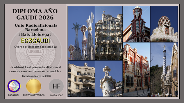 Coincidint amb el centenari de la mort de l’arquitecte Antoni Gaudí i Cornet (1852-1926), reconegut internacionalment com el màxim exponent del modernisme, motiu per a el qual tindran lloc diferents esdeveniments durant aquest any 2026, la Unió de Radioaficionats de Barcelona i Baix Llobregat URBBLL organitza el Diploma Any Gaudí 2026. L’activitat coincidirà amb la col·locació de la primera pedra del temple de la Sagrada Família, el 19 de Març de 1882. Per això el transcurs d’aquesta activitat serà del 16 al 22 de Març de 2026. S’activarà l’indicatiu EG3GAUDI.